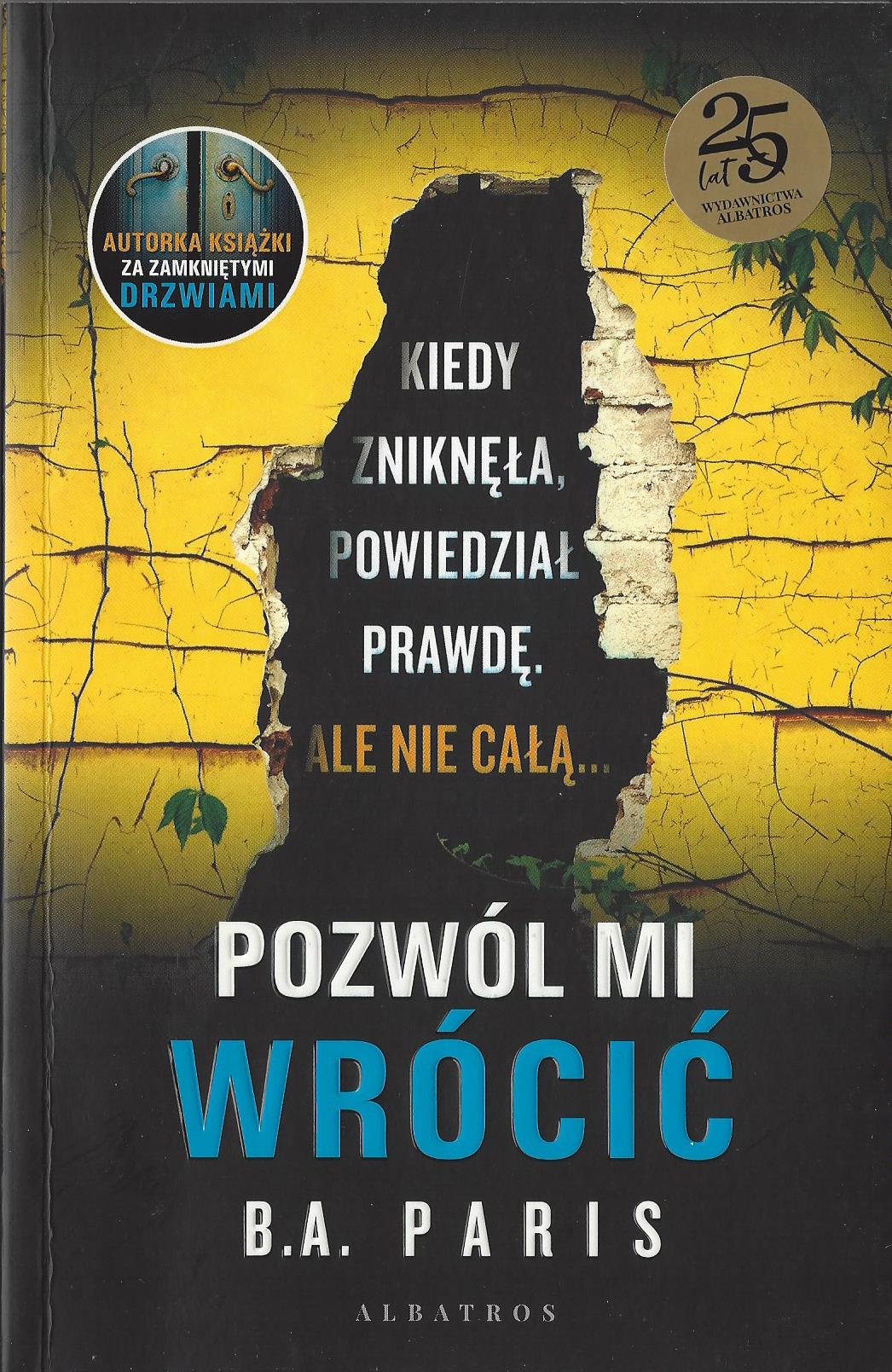 Autor: B.A. Paris Tytuł: Pozwól mi wrócić Tytuł oryginalny: Bring Me Back Wydawnictwo: Albatros Czas trwania: 7 godz. 28 min Fin podczas podróży do Francji zatrzymuje się na parkingu, by skorzystać z toalety. Gdy wraca do auta, jego dziewczyny w nim nie ma, mimo że parę chwil wcześniej zostawiał ją w środku. Layla znika bez śladu, a wielu nie daje wiary w zapewnienia mężczyzny, który twierdzi, że nie zrobił ukochanej krzywdy.